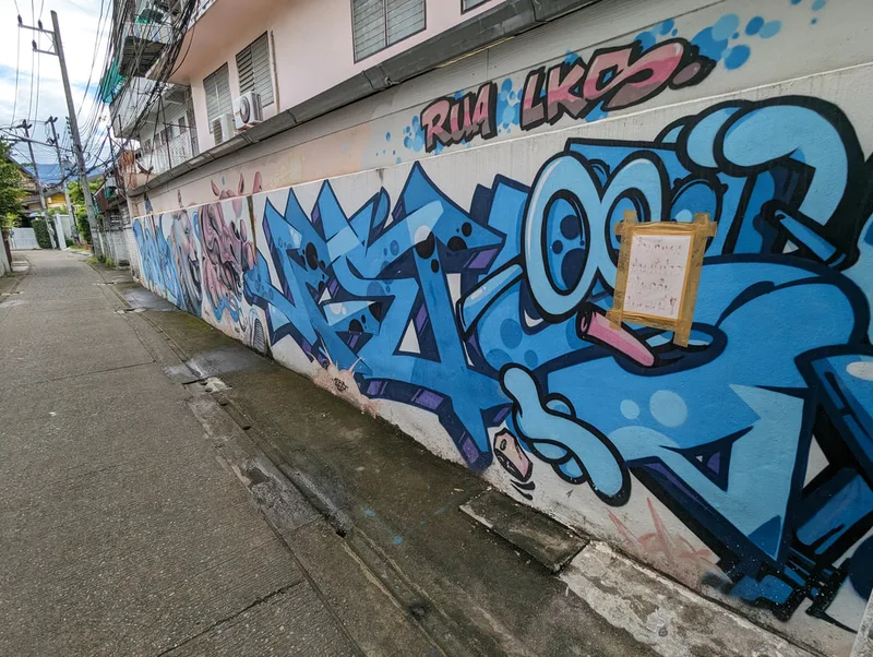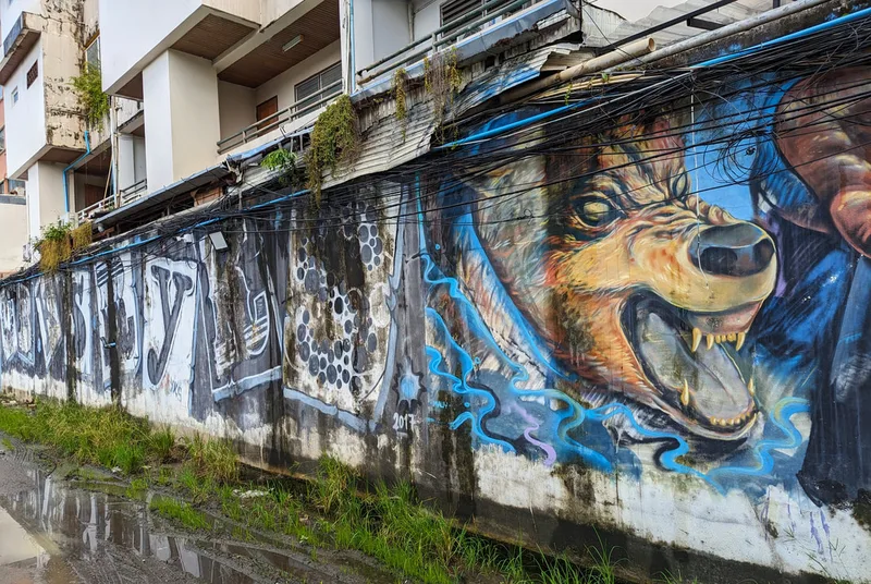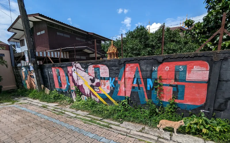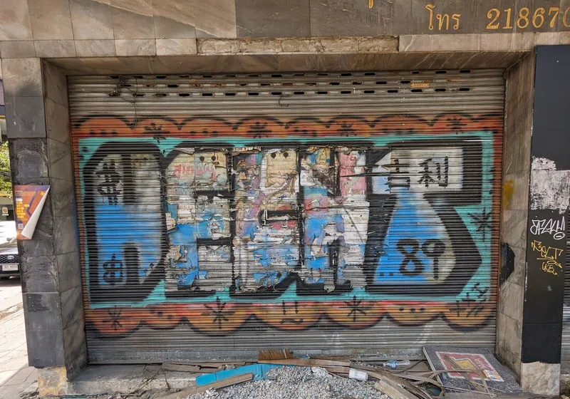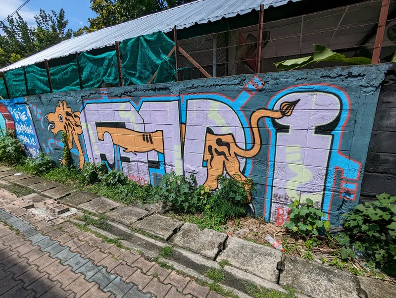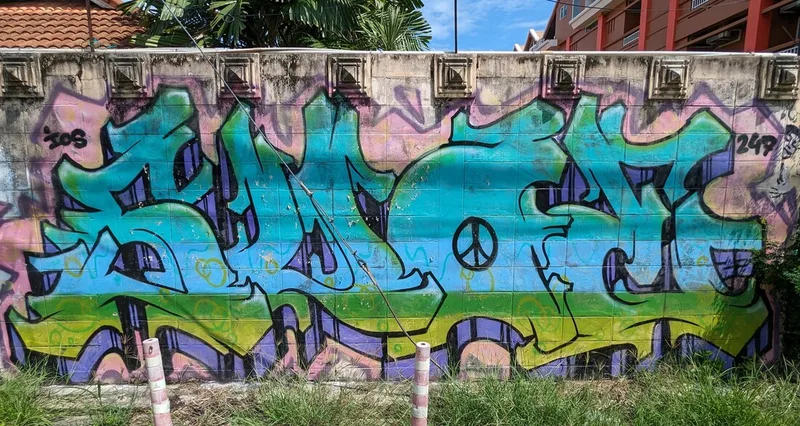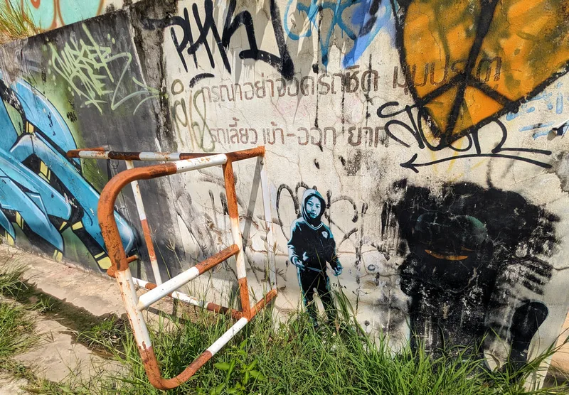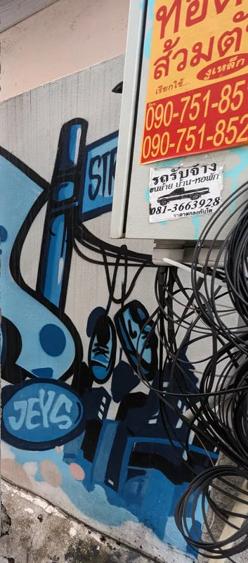 Whenever I travel, I like to experience all aspects of life in the place I am visiting. By visiting overlooked areas other tourists avoid, I am able to see more of a country and the people who live there. Thailand is a country of contrasts; around every corner there is another temple or religious monument, but there are also clues to other aspects of Thai life. Graffiti, rather like paintings in a gallery, document particular points in the history of a nation; although it is often unnoticed and unappreciated, its artistic merit is equally important.